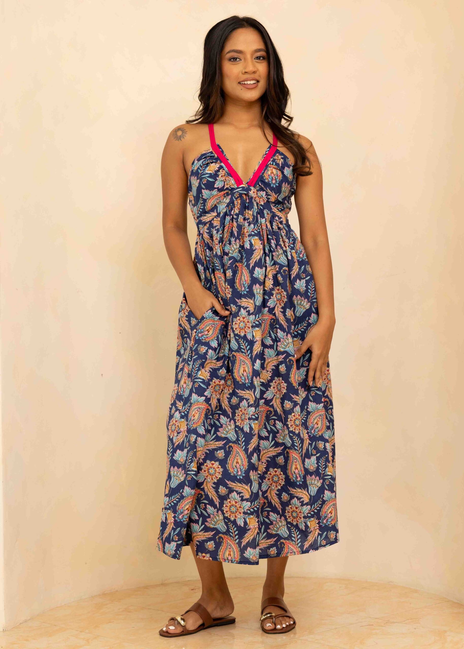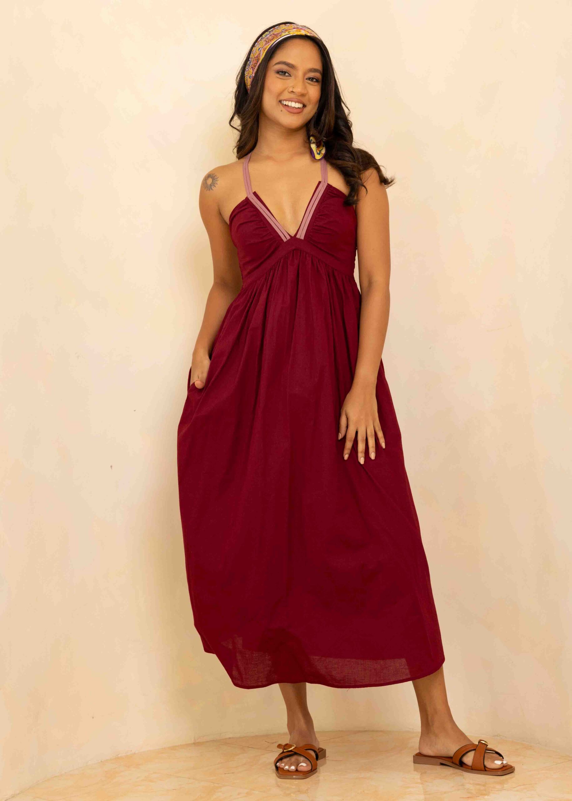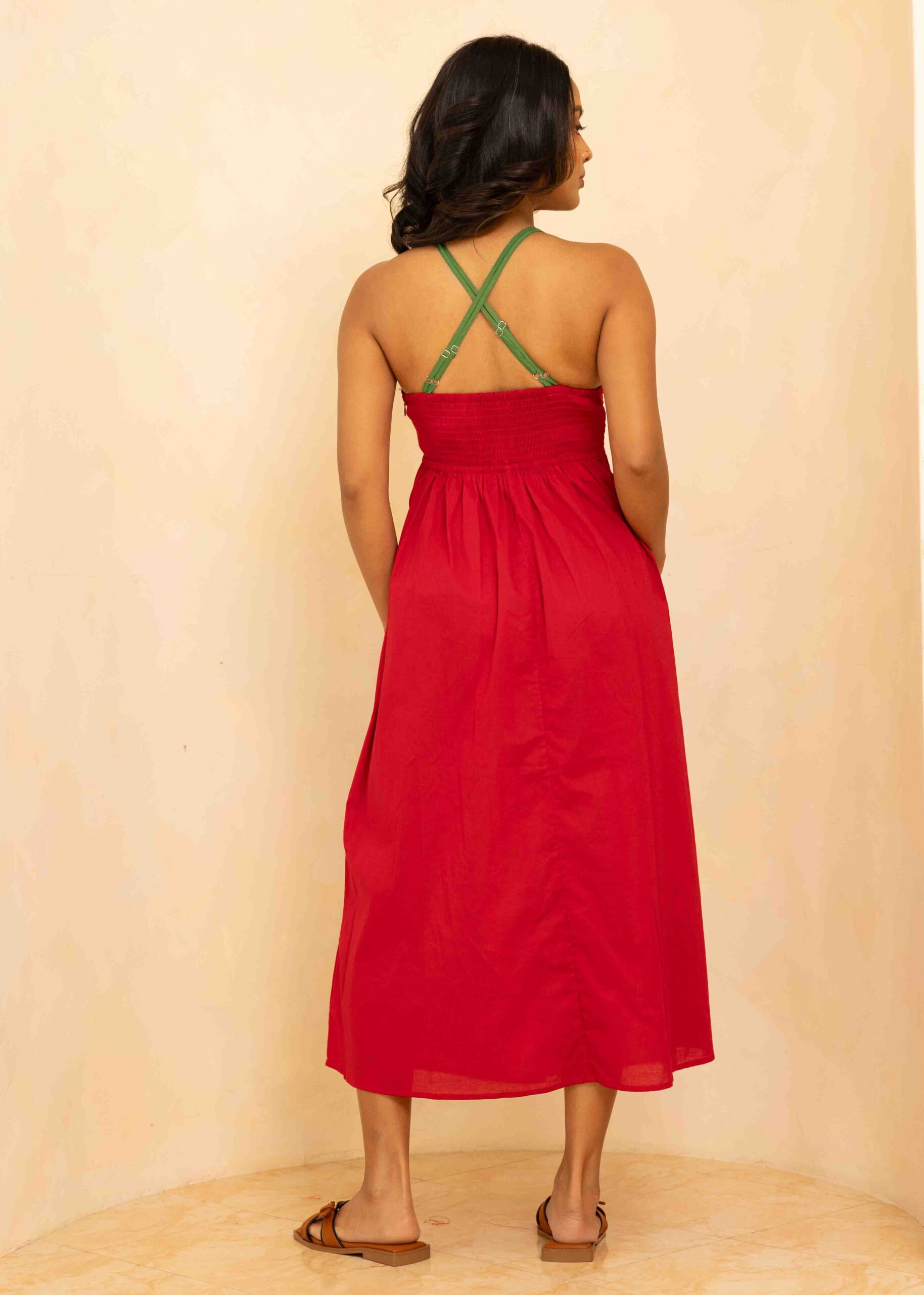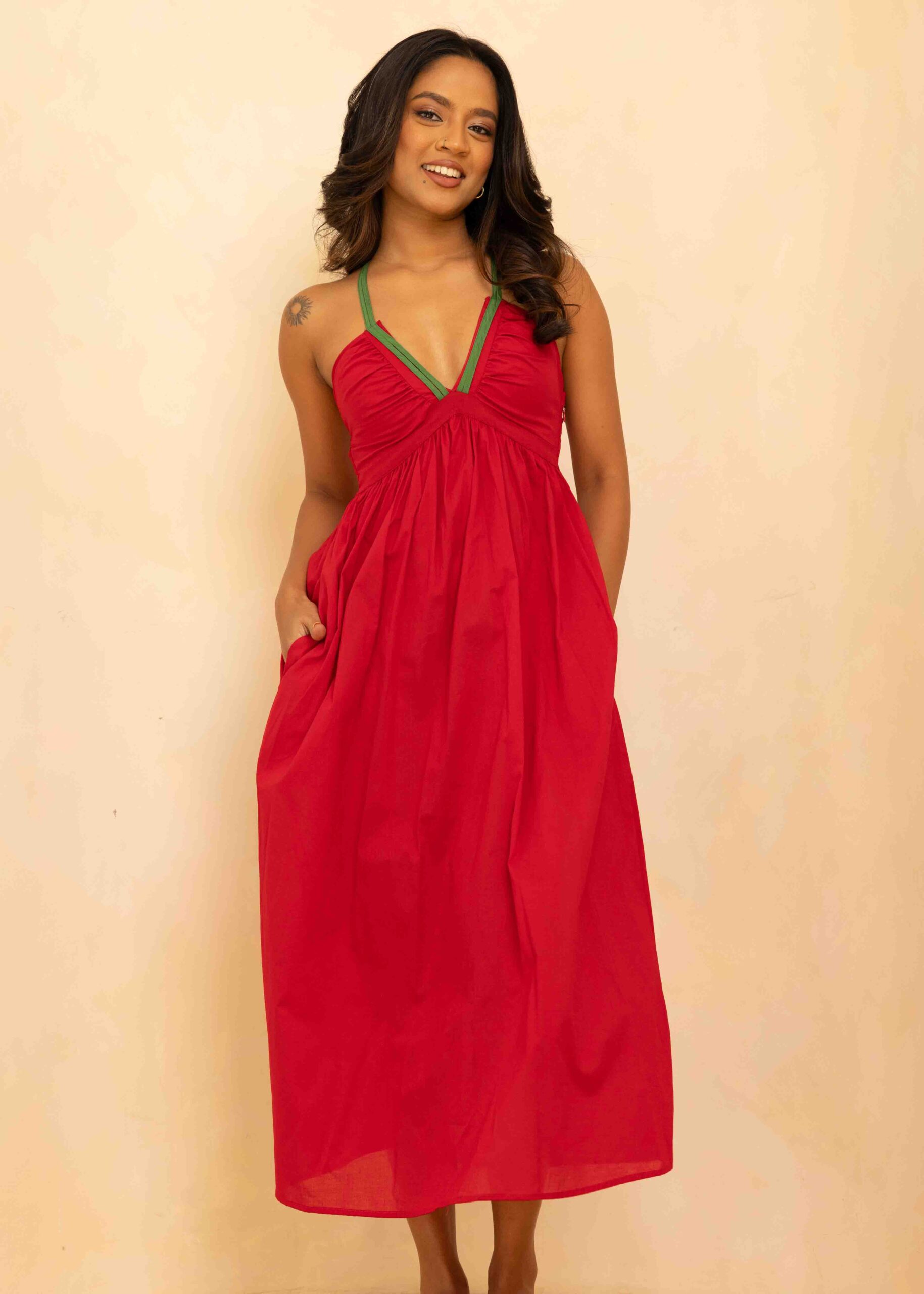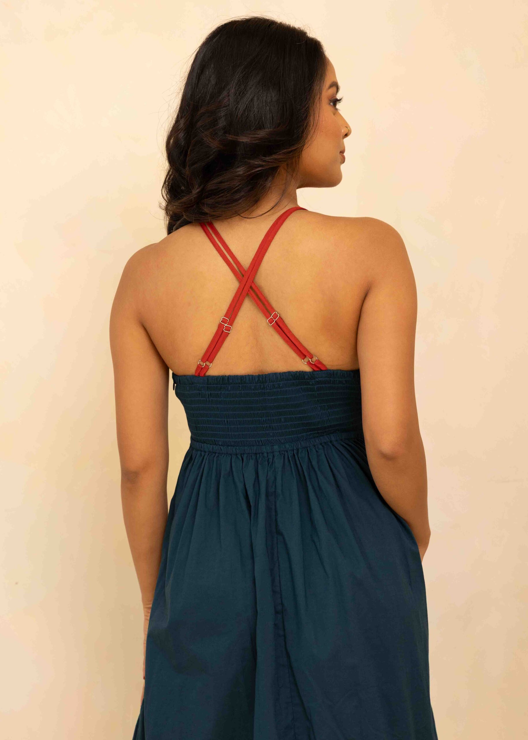 Perfectly balanced between casual charm and polished elegance, our Alyssa Dress is a midi dress with contrast piping straps and back smocked detailing. This versatile piece combines structured sophistication with comfortable ease, creating a look that effortlessly transitions from day to night. The contrast piping adds a refined touch while the back smocked detail ensures a flattering, comfortable fit that moves with you.
