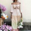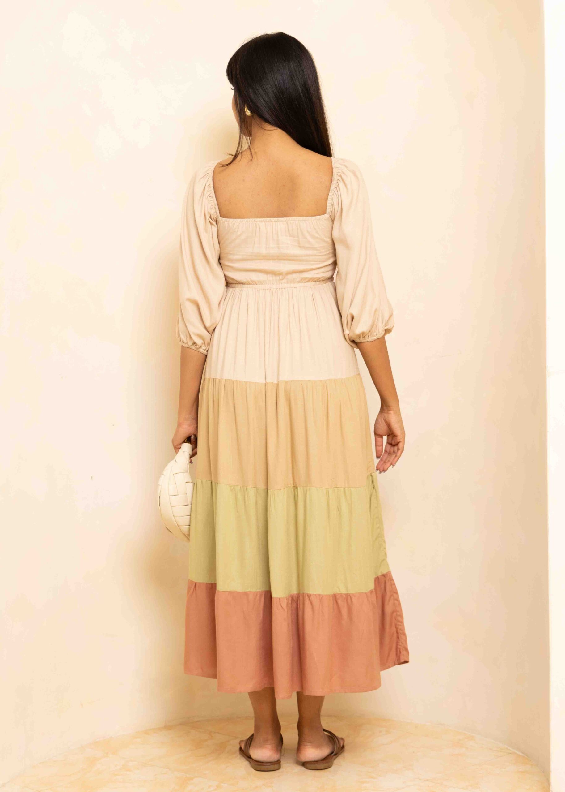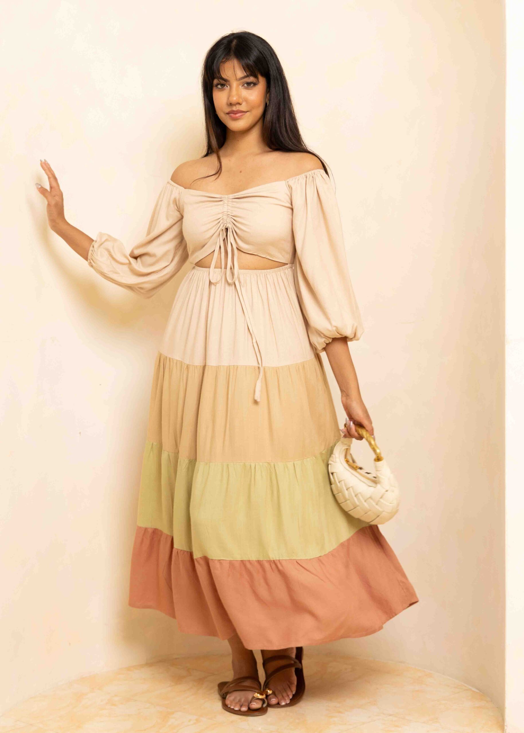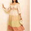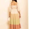 Romantic, flowing, and effortlessly chic, our Palm Tiered Maxi Dress cinches in at the waist and can be worn off-shoulder or with sleeves up. This stunning piece features a unique tiered design with a different color in every tier, creating beautiful visual dimension and movement. The front knot ruched detail adds feminine charm while the versatile styling options let you adapt the look to suit your mood and occasion.